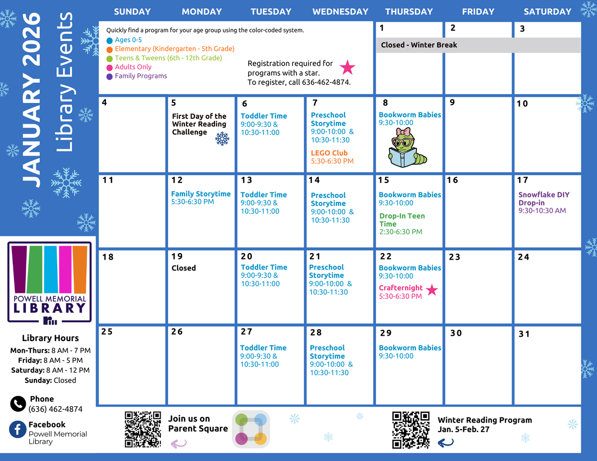 Start the new year with fun, free events for all ages at Powell Memorial Library. Check out whatβs happening and mark your calendars! ππ